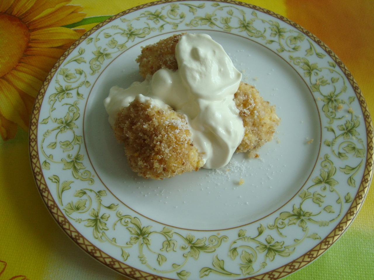 Ez alatt az idő alatt kevés olajon megpirítjuk a zsemlemorzsát és elkészítjük az édes tejfölös öntetet. A tejfölbe annyi édesítőt keverjünk, amennyi nekünk megfelelő. Én tulajdonképpen nem is készítettem el az öntetet, hanem csak egy kicsit megszórtam a gombócokat édesítővel és úgy tettem rá a sima tejfölt.